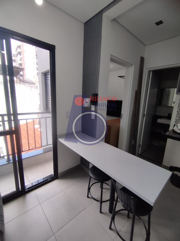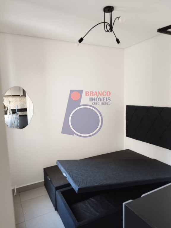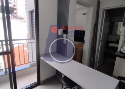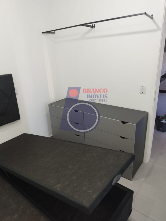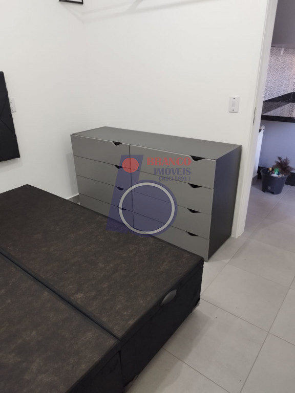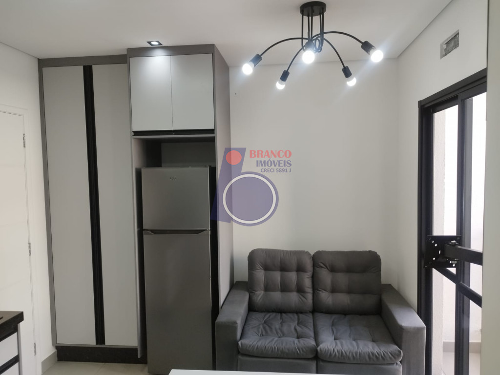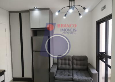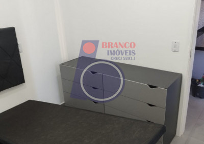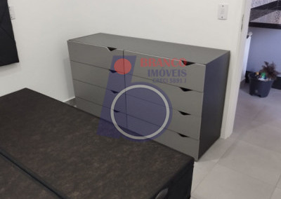 01 Dormitório (possui comoda com gavetas, arara para roupas e cama de casal bipartida e com baú), Sala estilo americana (com sofá), Sacada, Cozinha (com armários embutidos, gabinete, geladeira, cooktop por indução, exaustor, Mesa com 02 banquetas), WC (com chuveiro, box, gabinete).